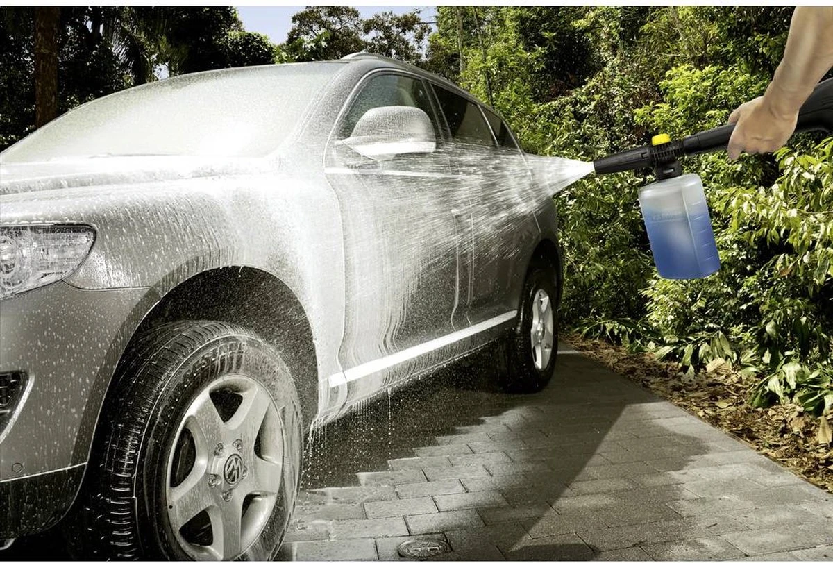 FJ 6 schuimsproeier met extra krachtig schuim voor een eenvoudige reiniging van alle oppervlakken zoals verf, glas en steen. Ideaal voor de reiniging van voertuigen, wintertuinen, tuinmeubelen, gevels, trappen, caravans, paadjes, muren, jaloezieën, terrassen, opritten enz. Reservoirinhoud van ongev. 0.6 liter. Giet het Kärcher reinigingsmiddel direct in de schuimsproeier, maak de sproeier vast aan het pistool en breng de schuim aan. De reinigingsmiddelendosering kan eenvoudig worden aangepast op de schuimsproeier (gele knop). Het spuitniveau kan ook naar wens worden aangepast. Geschikt voor alle Kärcher Home & Garden hogedrukreinigers uit de klassen K 2 – K 7. Ideaal voor gebruik met de Kärcher Ultra Foam Cleaner.