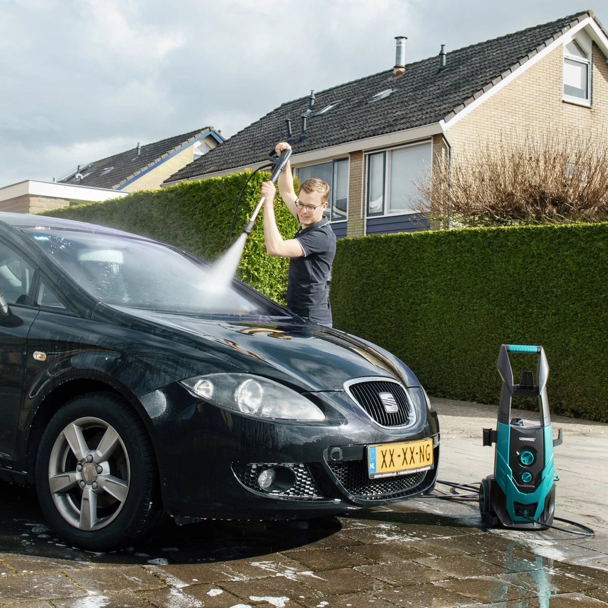 - Het reinigen van je terras, gevel of muur met reinigingsmiddelen die geschikt zijn voor hogedrukreinigers. Deze voeg je gemakkelijk toe aan de schoonmaakmiddelen tank. Let op; reinigingsmiddelen niet inbegrepen.